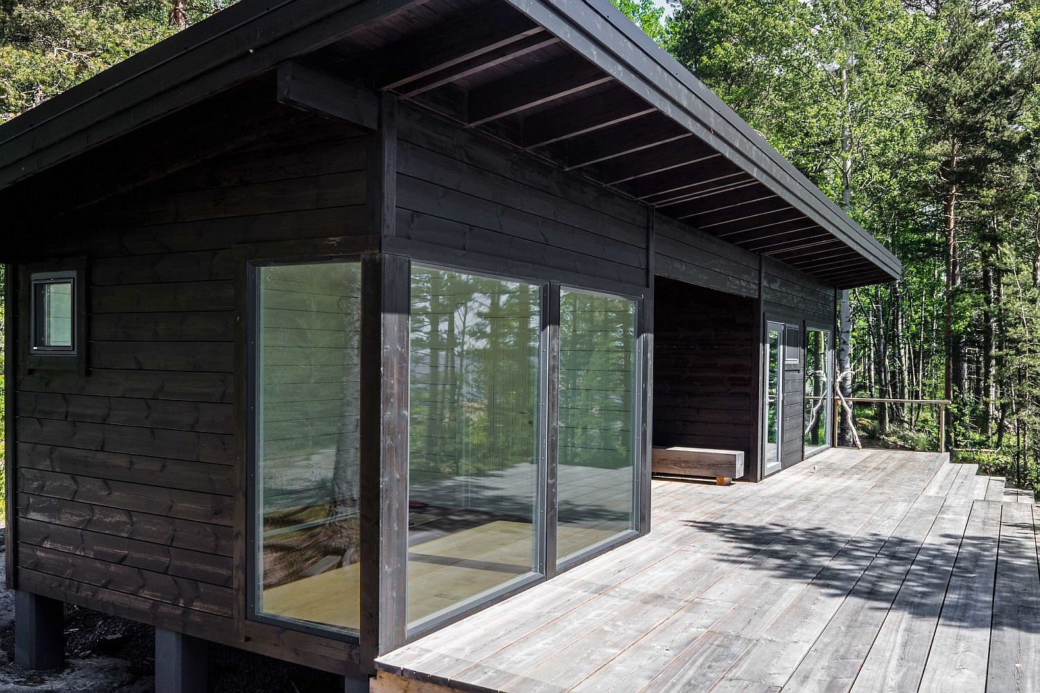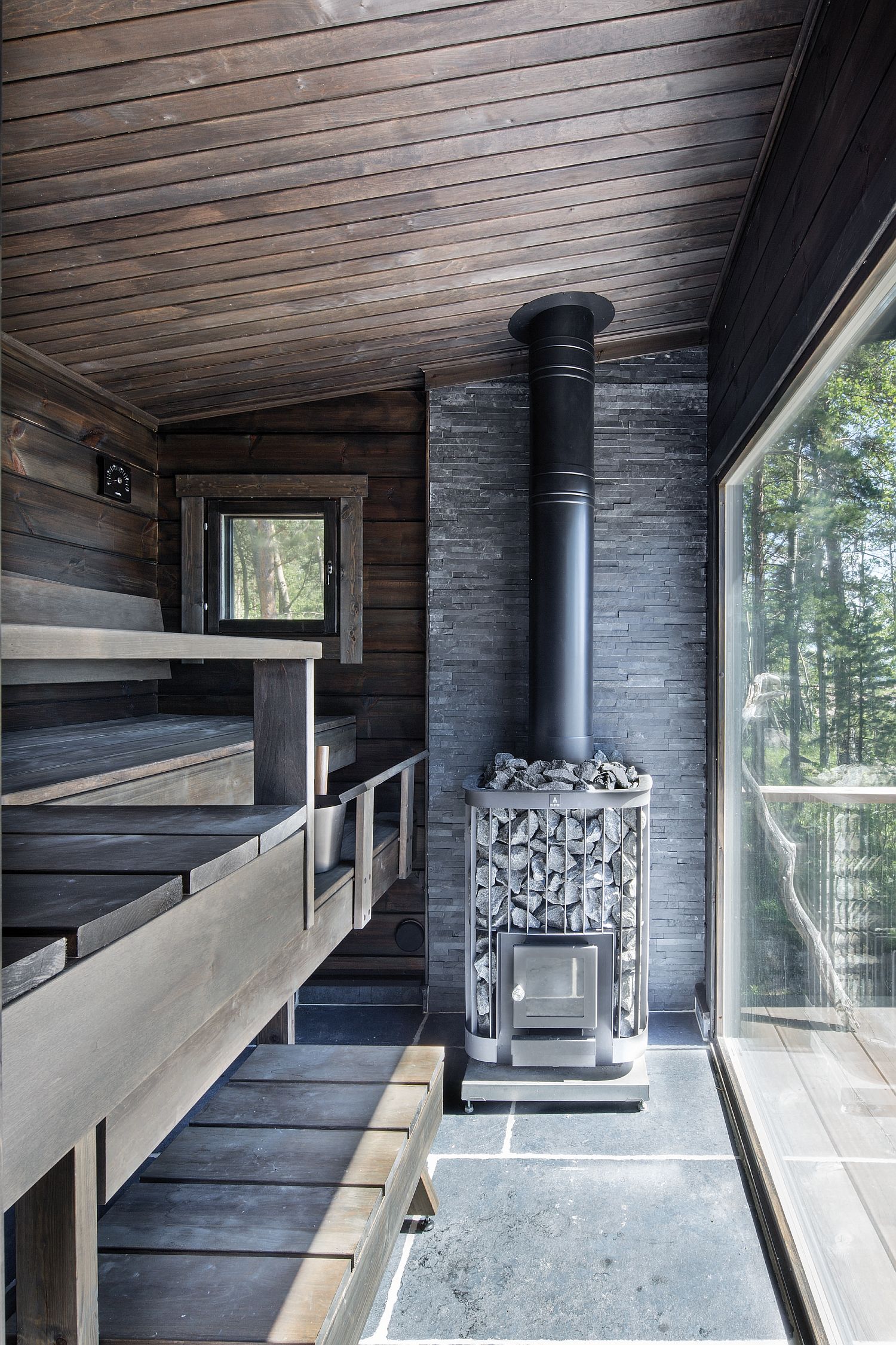 Designed by Pluspuu Oy, it is modern logs without the traditional corners that shape the exterior of this exclusive getaway. Dark, dashing and surrounded by greenery, the façade of the summer house is both unique and elegant. Step inside and the picture is completely transformed with white walls, a serene color palette, large floor-to-ceiling glass windows and Scandinavian décor painting a picture of tranquil ease. Comfort is carefully blended with Nordic design simplicity and an uncomplicated floor plan as two separate structures spread across the island hold the living units and the Finnish Sauna.